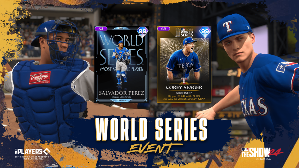 Try your hand at the Postseason: World Series Event to add Awards Series Salvador Perez (99 OVR) at 10 wins and The Show Classics Series Corey Seager (99 OVR) at 15 wins to your Diamond Dynasty squad in MLB The Show 24.