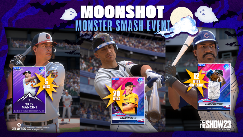 Load up your roster with brawny “bat”-ters then swing for the fences in the Moonshot: Monster Smash Event to earn Home Run Derby Series Trey Mancini (98 OVR) at 5 wins, HRD Series David Wright (99 OVR) at 20 wins, and HRD Series Andre Dawson (99 OVR) for earning 12 wins in one entry (12-1 or 12-0) before double elimination.
