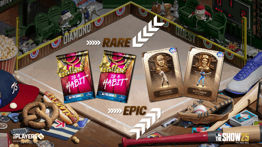 Step into greatness with the Hall of Fame Diamond Quest, launching July 27. Travel across baseball history in a special Diamond Quest board dedicated to Hall of Famers, featuring a bank of 30 hand-crafted Moments, 7 Showdowns, and a map filled with legendary rewards, tough opponents, and a nod to baseball immortality. Try your hand at the Hall of Fame Diamond Quest to unlock Rare Rewards including Ballin’ is a Habit Packs and Rare Rewards like Hall of Fame Series Cy Young (99 OVR) and Rod Carew (99 OVR).