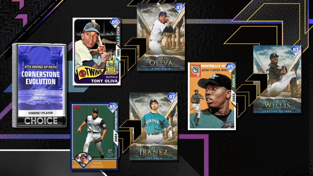 Earn 6th Inning Reward Path Cornerstone Evolution Packs in the 6th Inning XP Reward Path to add Rookie Series Dontrelle Willis (85 OVR), Contributor Series Raul Ibanez (85 OVR), and All-Star Series Tony Oliva (85 OVR) to your lineup. Use these player items to begin the all-new 6th Inning Cornerstone Evolution Programs, available in Assorted Programs, where you’ll complete Moments and Missions featuring each player to earn the Diamond Cornerstone Series Dontrelle Willis (97 OVR), Raul Ibanez (97 OVR), and Tony Oliva (97 OVR).