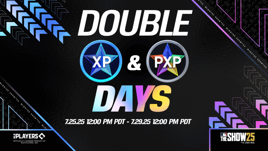 Jump start your 6th Inning XP Path progress during Double XP & PXP Days lasting until Tuesday, July 29th at 12:00 PM PDT, in MLB The Show 25. Earn 2x XP from playing in any game mode. Additionally, earn 2x PXP in Diamond Dynasty and unlock your favorite players’ parallels faster than ever.