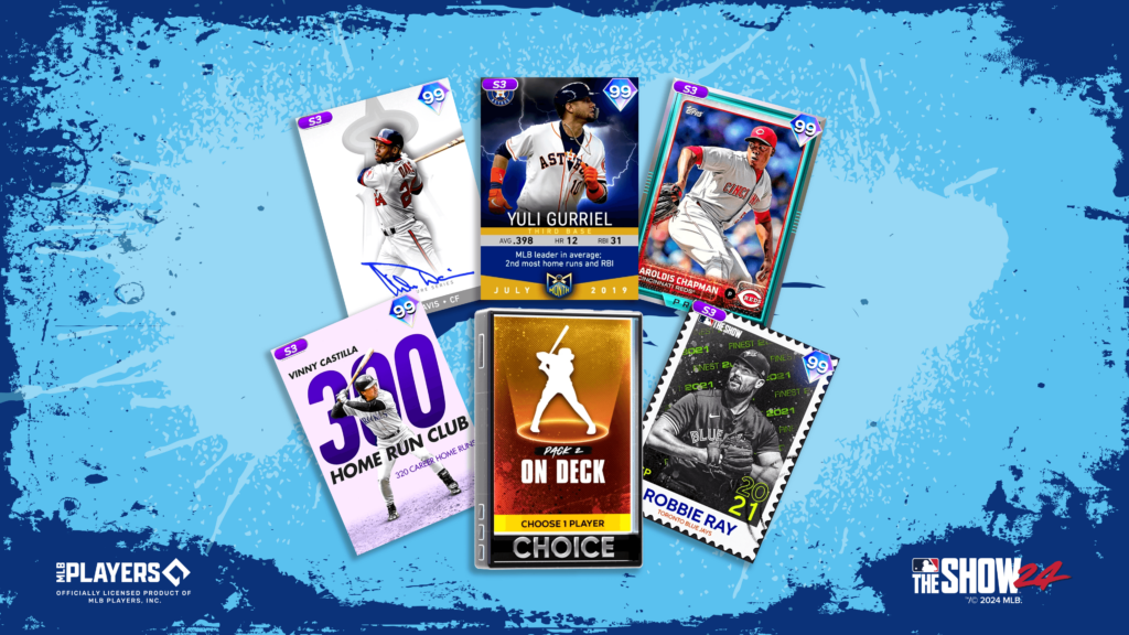 The On Deck Choice Pack 2 lets you choose one Diamond player from one of two tiers (Rare & Base) to add player items from some of your favorite card series to your lineup in MLB The Show 24 including: