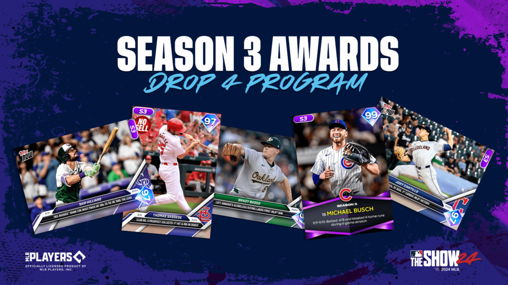 The Season 3 Awards Drop 4 Pack is your chance to add even more Topps Now & Season Awards Series players to your MLB The Show 24 lineup. At a cost of 30,000 Stubs with a limit of 5 packs per account, you’ll find one of these players in your Season 3 Awards Drop 4 Pack: