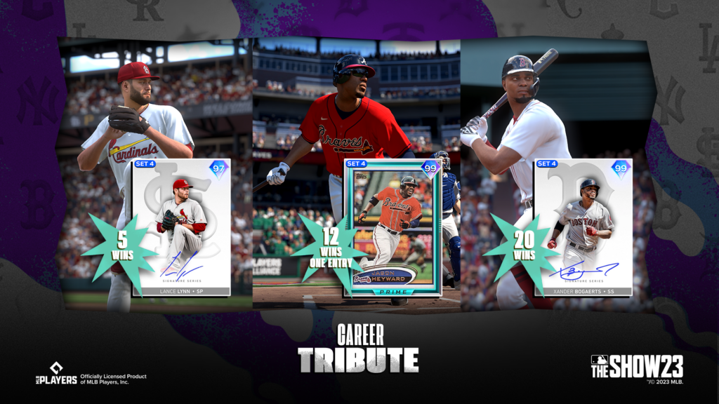 The Career Tribute event is your chance to earn even more player items, along with Packs, Stubs, and XP, for winning games. Get your mitts on Signature Series Lance Lynn (97 OVR) at 5 wins, Signature Series Xander Bogaerts at 20 wins, and Prime Series Jason Heyward (99 OVR) for 12 wins in one entry (12-1 or 12-0) before double elimination.