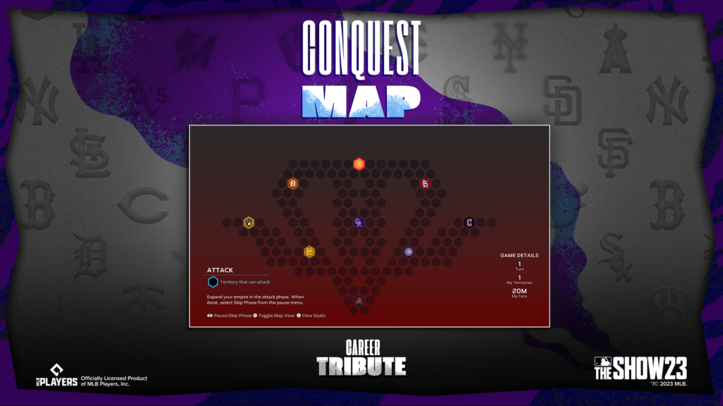 Take turns attacking territories, stealing your opponents’ fans, reinforcing your territories, and moving your fans to control the Career Tribute Program Conquest Map in this strategy-based game mode to earn progress in the Program along with additional rewards including Packs and Stubs.
