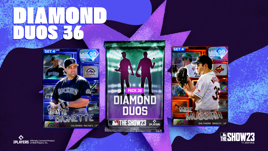 Diamond Duos Choice Pack 36 lets you choose 1 Gold or better player item with an increased chance to find the featured Diamond Duos 99 OVR player items: Great Race of ’98 Series Dante Bichette (99 OVR) and Great Race of ’98 Series Mike Mussina (99 OVR). Available now in The Show Shop, Diamond Duos Choice Pack 36 costs 40,000 Stubs, and is limited to 1 pack per user.