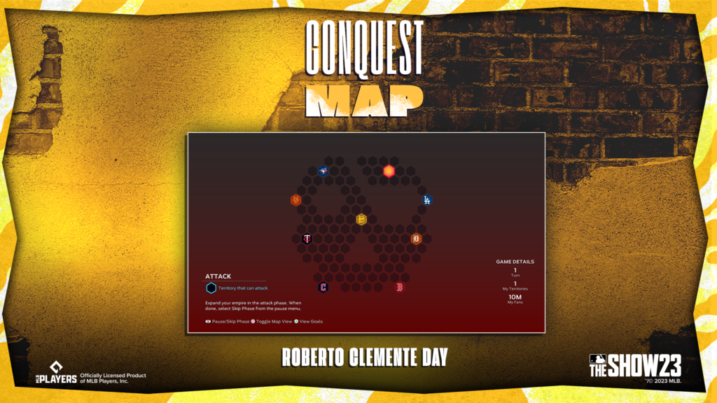 Complete the Roberto Clemente Day Conquest Map in this strategy-based mode while you take turns attacking territories with fans, stealing opponents’ fans, and reinforcing your territories. Keep moving your fans to control and conquer the map! Look for hidden rewards including Stubs & Packs while gain progress towards the Program.