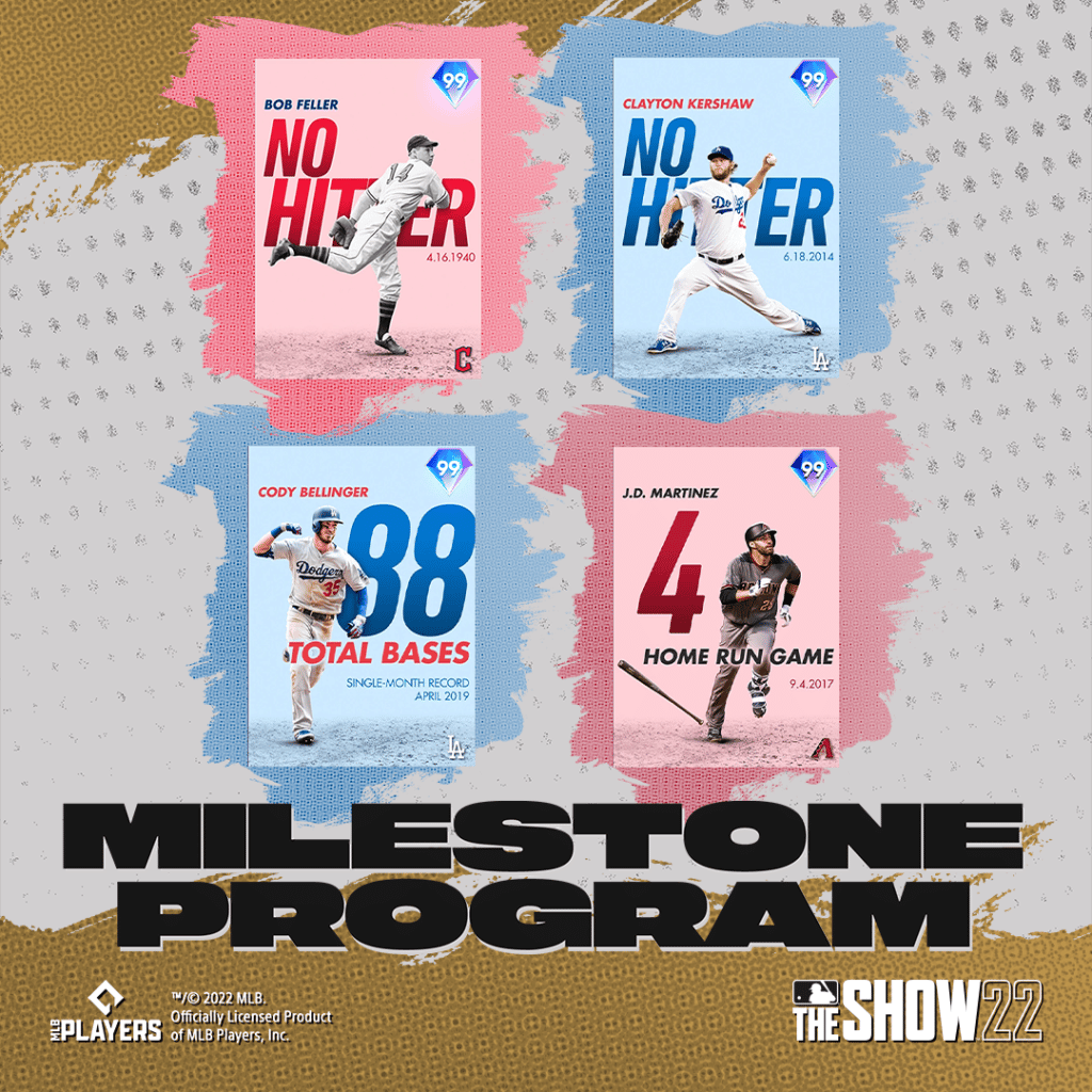 Take on brand-new Missions and Moments, as well as a Showdown in the Milestone Program available now. Earn Program Stars to add Milestone J.D. Martinez, Milestone Bob Feller, Milestone Cody Bellinger, and Milestone Clayton Kershaw to your Diamond Dynasty squad.