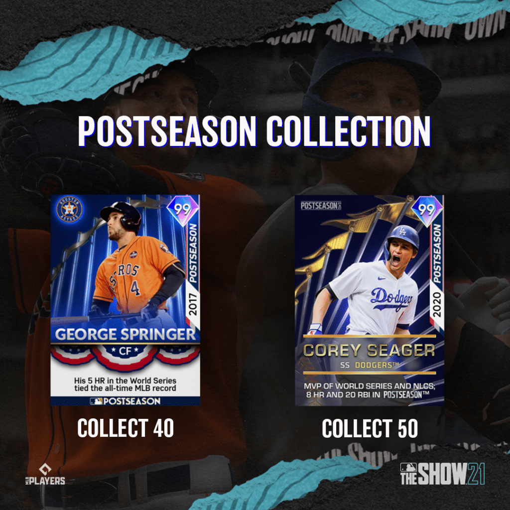 Collect Legends & Flashbacks from both the 2021 Postseason and regular Postseason series to get your mitts on some former World Series heroes! Collect 40 to get 2017 Postseason George Springer and 50 for 2020 Postseason Corey Seager, both 99 OVR.