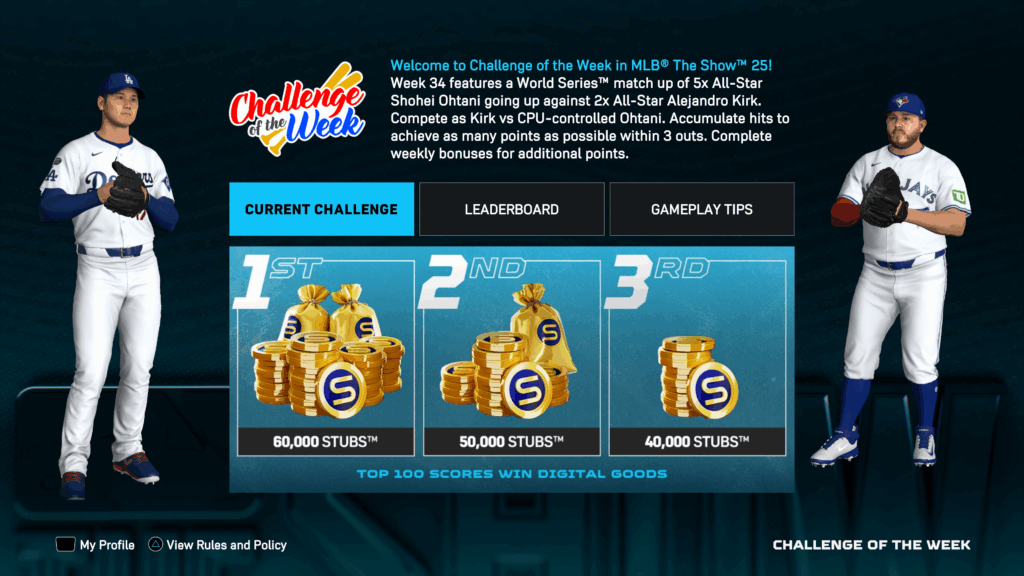 Challenge of the Week 34, available in Instant Action, features a World Series matchup of 5-time All-Star Shohei Ohtani going up against 2-time All-Star Alejandro Kirk. Compete as Kirk vs CPU-controlled Ohtani and accumulate hits to achieve as many points as possible within three outs for a chance to earn Stubs for use in MLB The Show 25.