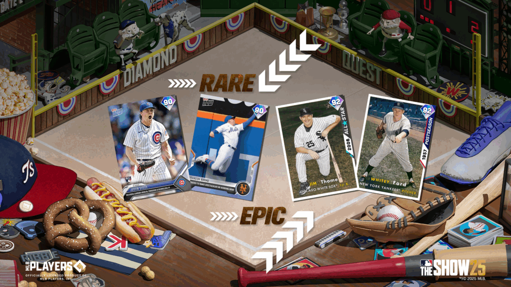 Play through Moments and Mini Boss Showdowns featuring baseball’s most iconic uniforms. Deliver strikeouts, clutch hits, and lockdown saves across a uniform-themed Diamond Quest board in the Pinstripes Diamond Quest for a chance to earn Rare Rewards: Topps Now Series Justin Steele (90 OVR) & Brandon Nimmo (90 OVR) and Epic Rewards: Postseason Series Whitey Ford (92 OVR) & All-Star Series Jim Thome (92 OVR).