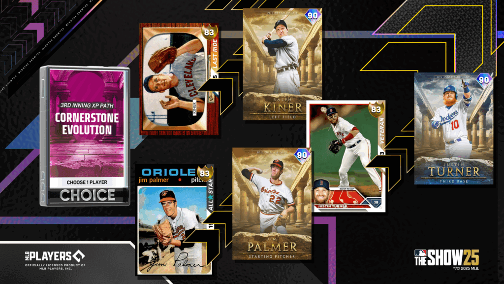 Earn 3rd Inning Reward Path Cornerstone Evolution Packs in the 3rd Inning XP Reward Path to add the Gold All-Star Series Jim Palmer (83 OVR), Veteran Series Justin Turner (83 OVR), and Last Ride Series Ralph Kiner (83 OVR) to your roster. Use these player items to begin the all-new 3rd Inning Cornerstone Evolution Programs, available in Assorted Programs, where you’ll complete Moments and Missions featuring each player to earn the Diamond Cornerstone Series Jim Palmer (90 OVR), Justin Turner (90 OVR), and Ralph Kiner (90 OVR) as the newest additions to your Diamond Dynasty squad.