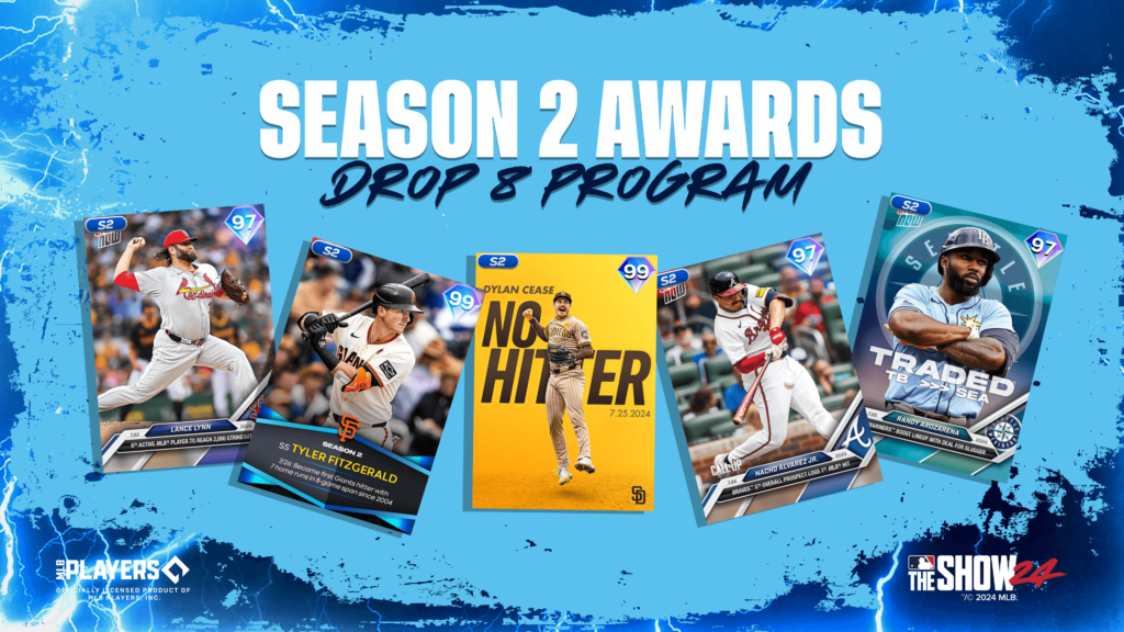 The Season 2 Awards Drop 8 Program, available today, is your chance to earn all-new Topps Now & Season Awards Series players, as well as Milestone Series Dylan Cease, to improve your squad in MLB The Show 24.