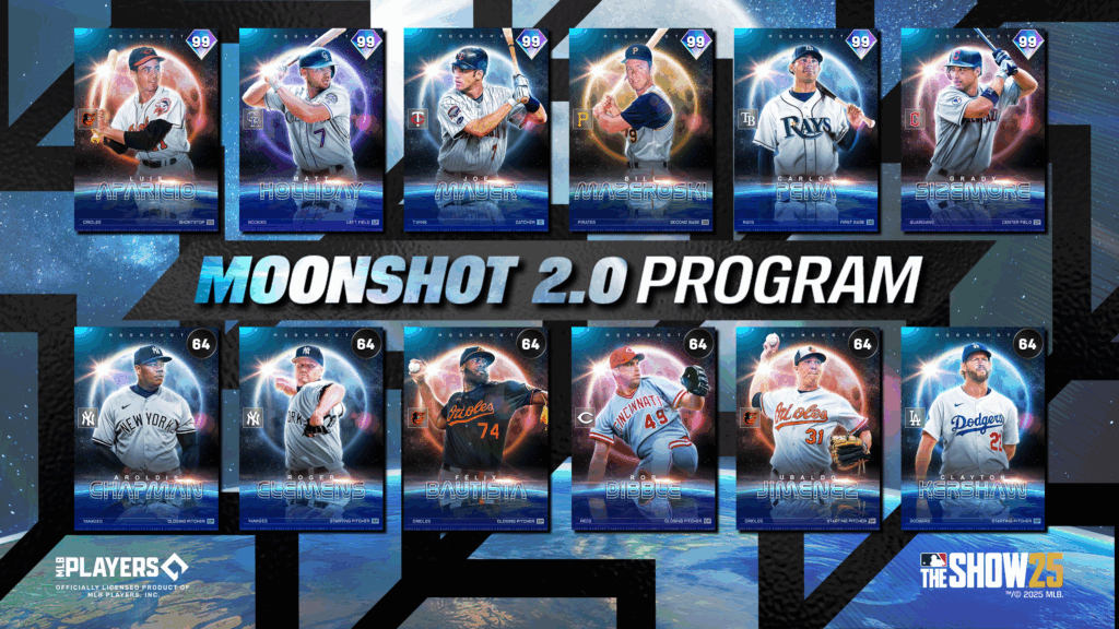 Swing for the fences in the all-new Moonshot 2.0 Program, only available in MLB The Show 25. Play Moments featuring Moonshot 2.0 Program players, including the Optional Extreme: Higher Gravity Moments, to start your progression in the program. Try your hand at the Moonshot 2.0 Program Missions, Moonshot Series Missions, and the Optional Moonshot 2.0 Event Missions to earn additional progress. Complete the updated Moonshot Series Collection, and the Optional: Moonshot 2.0 Pack Collections, to add the following “out of this world” rewards to your Diamond Dynasty squad: