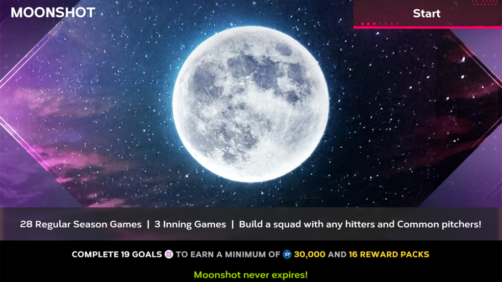 The Moonshot Mini Seasons Challenge tasks you with taking on the fictitious Global Baseball League’s (GBL) best in 28 regular season, 3 inning games as you make your way to the GBL Championship, while completing goals, to earn XP and up to 16 reward packs.