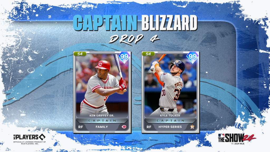 Get ready to experience an avalanche of athletic aptitude as you look to add Captain Series Ken Griffey Sr. (99 OVR – Boost players with a brother or father in MLB The Show 24) and Captain Series Kyle Tucker (99 OVR – Boosts Hyper Series players) by taking on the Captain Blizzard Drop 4 Program available today.