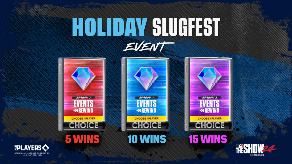 Bring your best batters with 100+ Power, POW L or R, and take a swing in the Holiday Slugfest Event to earn a Season 1 Events Rewind Pack at 5 wins, a Season 2 Events Rewind Pack at 10 wins, and a Season 3 Events Rewind Pack at 15 wins featuring player item rewards from Events in each of those previous Seasons.