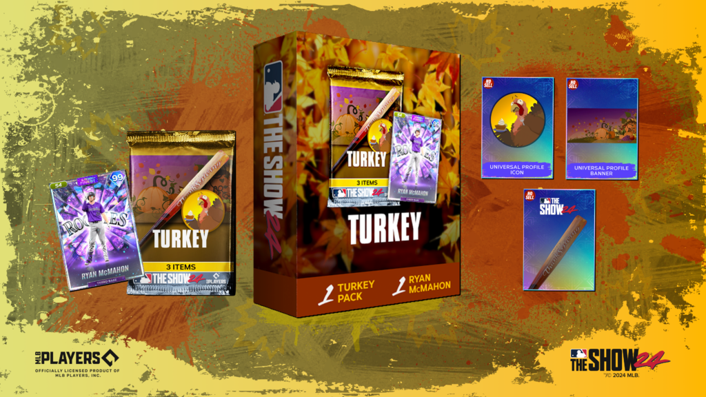 MLB The Show 24 wants to give thanks to all our players and to do so we’re giving everyone a FREE Turkey Bundle. The Turkey Bundle is stuffed with rewards including 2024 Finest Series Ryan McMahon (99 OVR) and a Turkey Pack that contains a Thanksgiving Universal Profile Icon, Banner, and Batskin. The FREE Turkey Bundle is available today in The Show Shop and is limited to 1 Bundle per account.