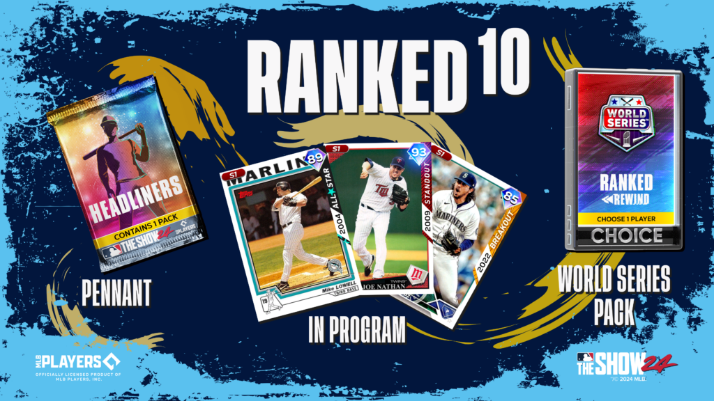 Complete Solo & Co-Op Ranked Stat Missions in the Ranked 10 Program to earn Breakout Series Andres Munoz at 20 Stars, All-Star Series Mike Lowell at 40 Stars, and Standout Series Joe Nathan at 65 Stars. Increase your rating to reach the World Series division or earn 100 Program Stars to get your mitts on your first World Series Ranked Rewind Choice Pack to choose from player items featured in each of the past Ranked Programs’ World Series Reward Packs. Complete the entire Ranked Program to earn up to five World Series Rewind packs.