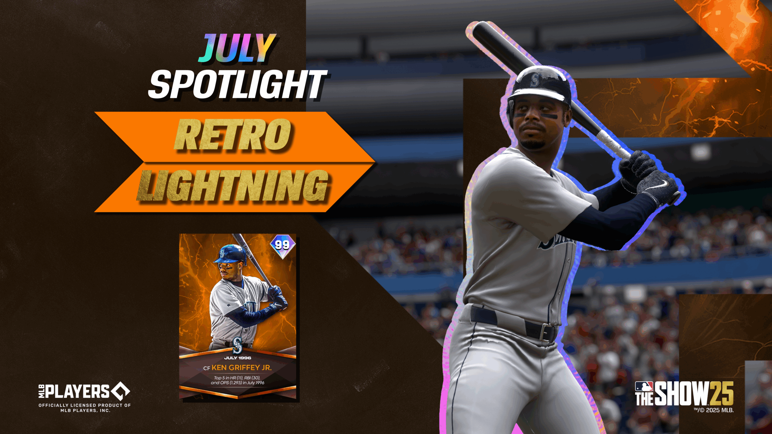 Ken Griffey Jr. sparks memories of baseball’s past as the July Retro Lighting Player in MLB The Show 25. In July of 1996 baseball’s favorite son, Griffey Jr., was in the MLB’s Top 5 for home runs with 11, RBI with 30, and OPS at 1.293.