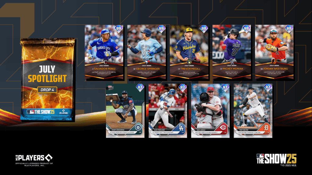 Complete July Spotlight Programs – Drops 1 through 4, then collect each of the July Spotlight Programs featured players (Addison Barger, Cody Bellinger, Shea Langeliers, and Jarren Duran) in the Spotlight Series July Lightning Collection, only available in MLB The Show 25, to add Lightning Willy Adames (99 OVR) to your Diamond Dynasty roster.