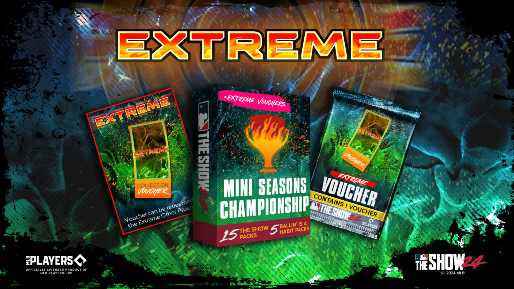 Take on the fictitious Global Baseball League’s (GBL) best in 28 regular season, 3 inning games as you make your way to the championship in the Extreme Mini Season challenge to earn XP, Stubs, and Packs along with Extreme Vouchers that can be exchanged for additional progression in the Extreme Program.