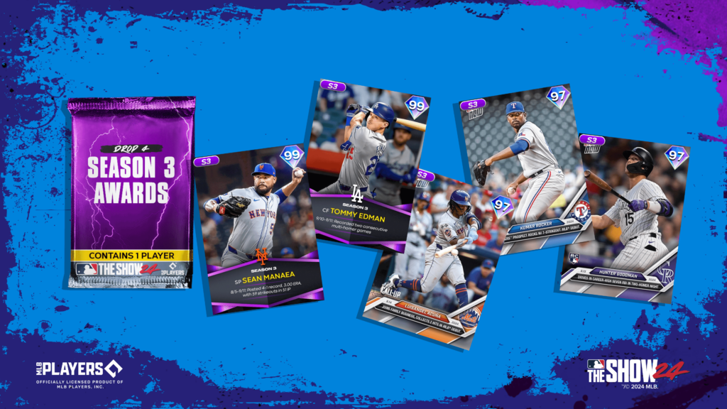The Season 3 Awards Drop 4 Pack is your chance to add even more Topps Now & Season Awards Series players to your MLB The Show 24 lineup. At a cost of 30,000 Stubs with a limit of 5 packs per account, you’ll find one of these players in your Season 3 Awards Drop 4 Pack: