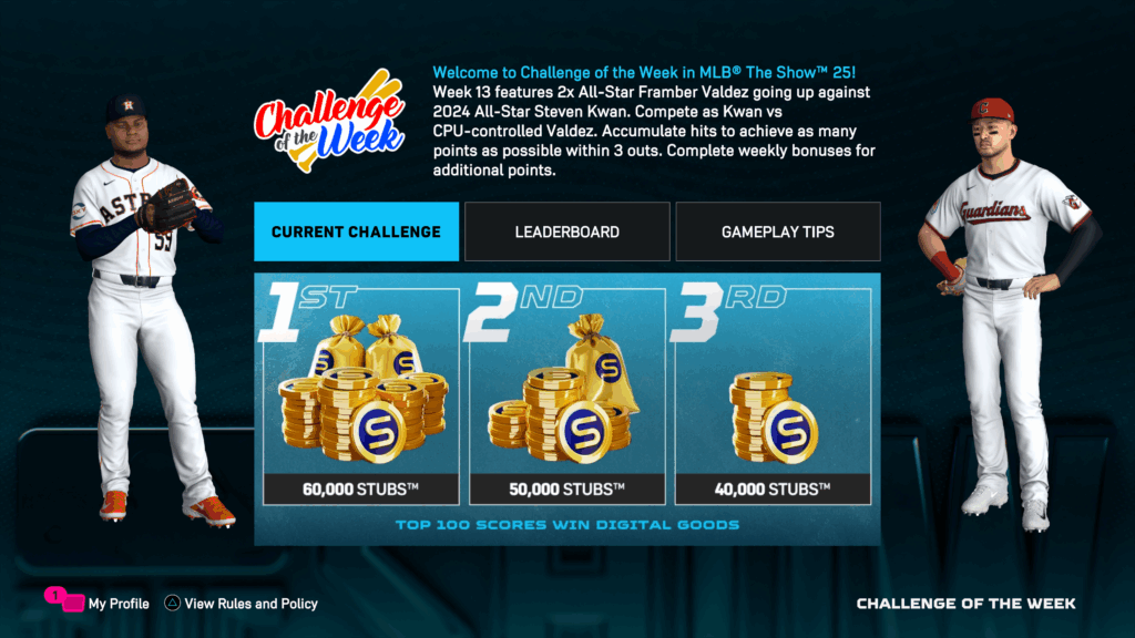 Challenge of the Week 13, available in Instant Action, features 2-time All-Star Framber Valdez going up against 2024 All-Star Steven Kwan. Compete as Kwan vs CPU-Controlled Valdez, and accumulate hits to achieve as many points as possible within 3 outs for a chance to earn Stubs for use in MLB The Show 25.