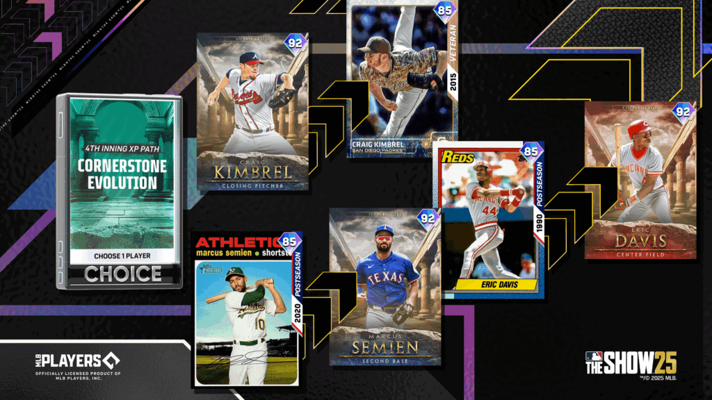 Earn 4th Inning Reward Path Cornerstone Evolution Packs in the 4th Inning XP Reward Path to add the Veteran Series Craig Kimbrel (85 OVR), Postseason Series Eric Davis (85 OVR), and Postseason Series Marcus Semien (85 OVR) to your lineup. Use these player items to begin the all-new 4th Inning Cornerstone Evolution Programs, available in Assorted Programs, where you’ll complete Moments and Missions featuring each player to earn the Diamond Cornerstone Series Craig Kimbrel (92 OVR), Eric Davis (92 OVR), and Marcus Semien (92 OVR).