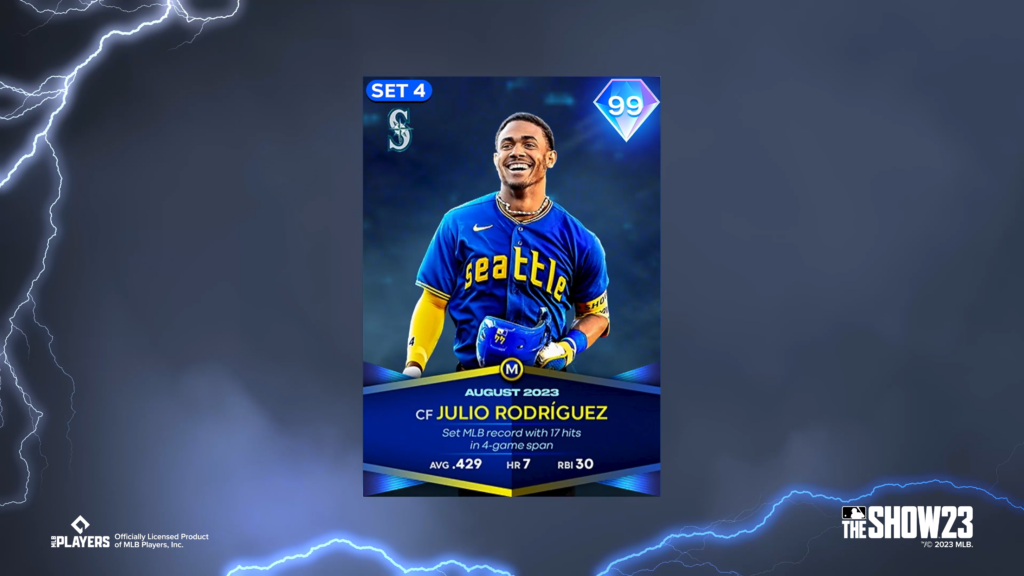 Julio Rodriguez gave a striking performance in the month of August clinching the Monthly Awards Program Lightning player spot in MLB The Show 23. The two-time All-Star hit .429 with 7 home runs, 30 RBI, and 10 Doubles while breaking a long-standing Major League record by collecting 17 hits over four games earning him the American League Player of the Month award for August.