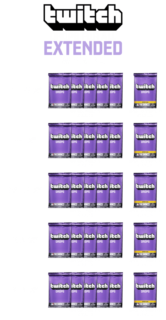 But that’s not all! Exclusively for this Extended Weekend, fans can earn five more Twitch Packs and one Elite Twitch Pack, which includes TWO Number Retirement Choice Packs and TWO Jumbo Show Packs! To earn the Elite Twitch Pack, just watch any MLB® The Show™ 23 broadcast tagged with ‘Drops Enabled’ and you will earn a Twitch Pack every four hours, with the final pack being the Elite Twitch Pack unlocked after another four hours, so 24 hours of cumulative watch time.