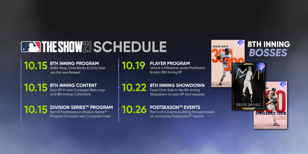The 8th Inning Program is upon us, and we’re rolling out some amazing bosses as Milestone Willie Mays, Awards Ernie Banks and Milestone Chris Sale take the field. Try your hand at brand-new Missions, Collections, and a Conquest Map to earn XP that will unlock these player items and add them to your lineup in MLB The Show 21.