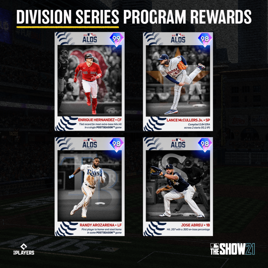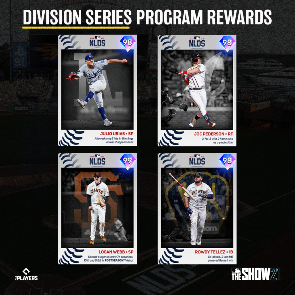 The all-new Division Series Program lets you take control and relive some of the most memorable plays from the ALDS and NLDS. The Division Series Program rewards path features 8 new player items from each of the teams in the series, as well as packs, stubs and more.