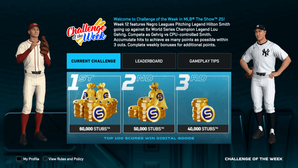 Challenge of the Week 12, available in Instant Action, features Negro Leagues Pitching Legend Hilton Smith going up against 6-time World Series Champion Legend Lou Gehrig. Compete as Gehrig vs CPU-Controlled Smith, and accumulate hits to achieve as many points as possible within 3 outs for a chance to earn Stubs for use in MLB The Show 25.