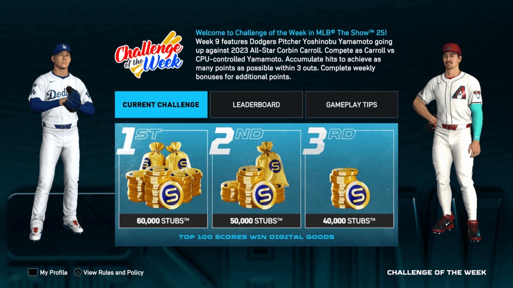 Challenge of the Week 9, available in Instant Action, features Dodgers pitcher Yoshinobu Yamamoto going up against 2023 All-Star Corbin Carroll. Play as Carroll vs CPU-Controlled Yamamoto and accumulate hits to achieve as many points as possible within 3 outs to earn Stubs for use in MLB The Show 25.
