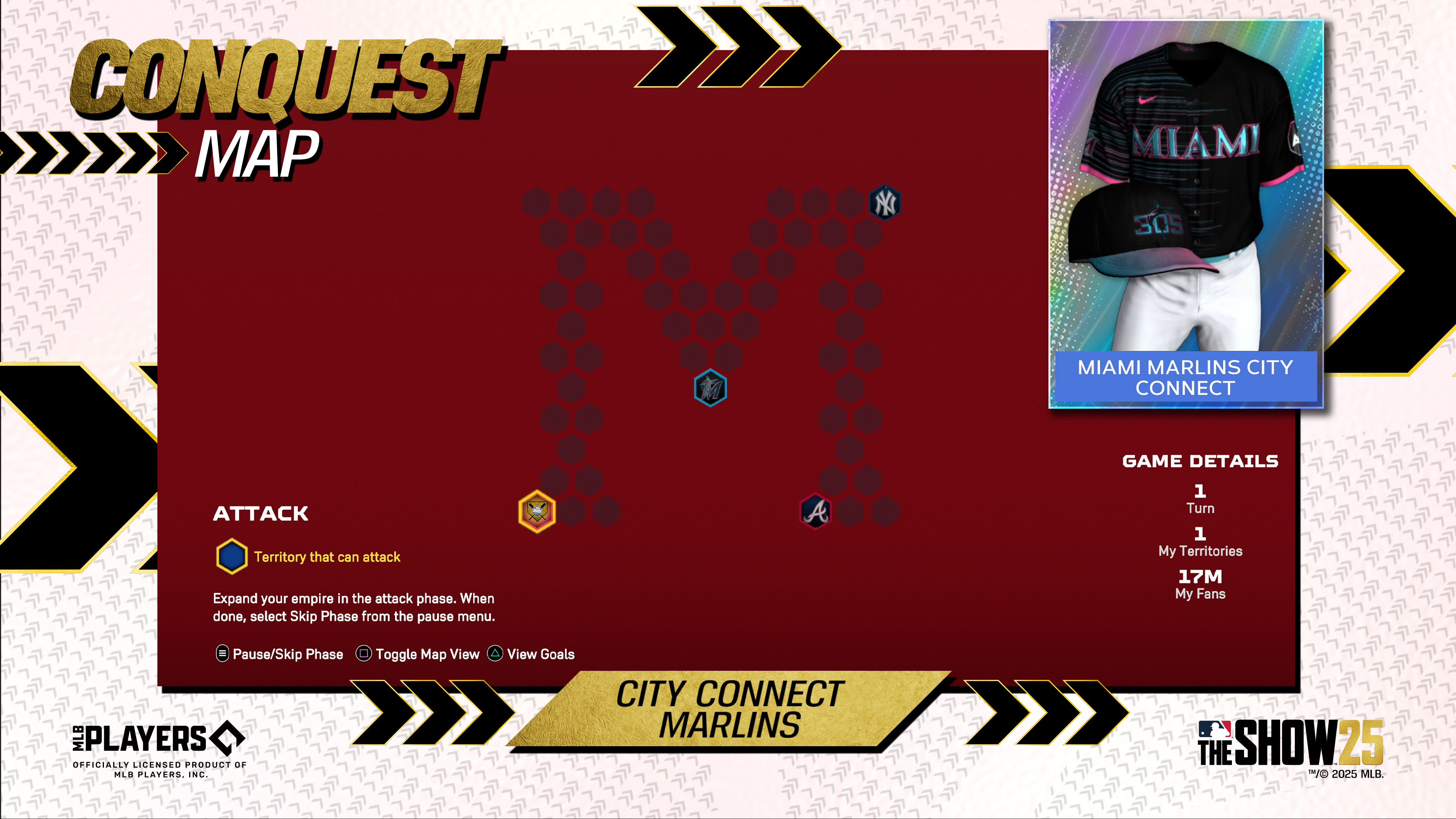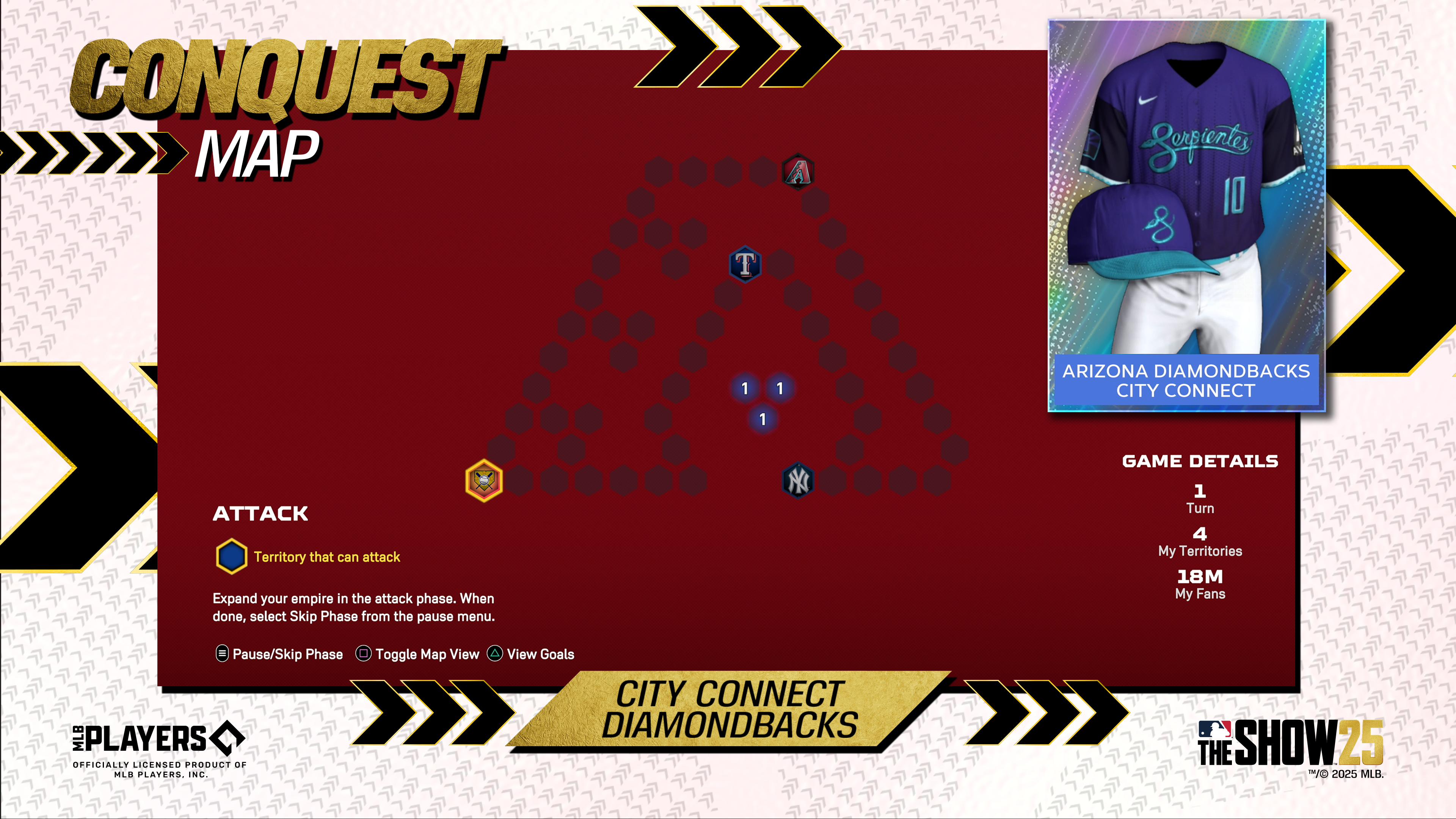Take turns attacking territories, stealing your opponents’ fans, reinforcing your territories, and moving your fans in the City Connect Marlins and City Connect D-backs Maps, available in Conquest, for two chances to earn XP, Packs, Stubs, and the all-new Nike City Connect Miami Marlins and Nike City Connect Arizona Diamondbacks uniform items, respectively, for use in MLB The Show 25.