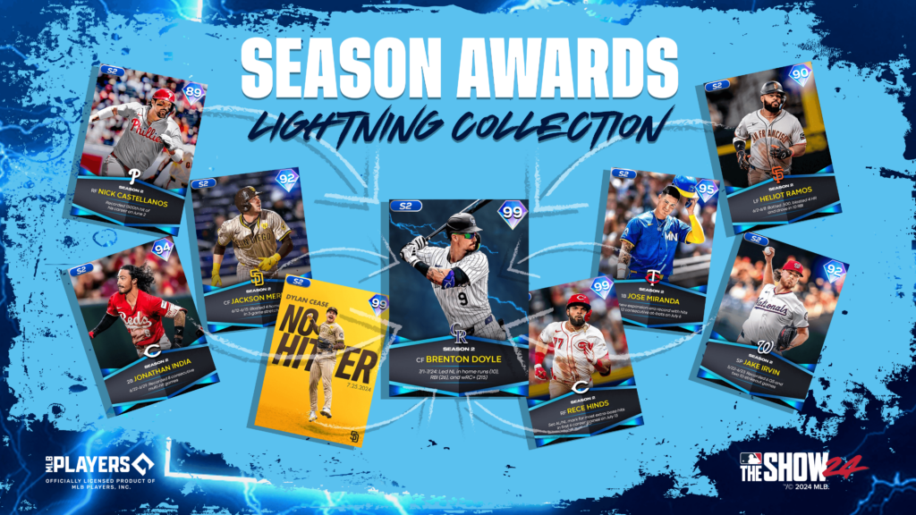 If you’re looking to add Season Awards Series Lightning Brenton Doyle to your lineup, Collect Season 2 Awards Program player items from Drops 1 through 7 (Nick Castellanos, Heliot Ramos, Jackson Merrill, Jake Irvin, Jonathan India, Jose Miranda, & Rece Hinds) as well as Milestone Series Dylan Cease from Drop 8 in the Season 2 Awards Collection and Doyle will be bringing his electric spark to your roster in no time.