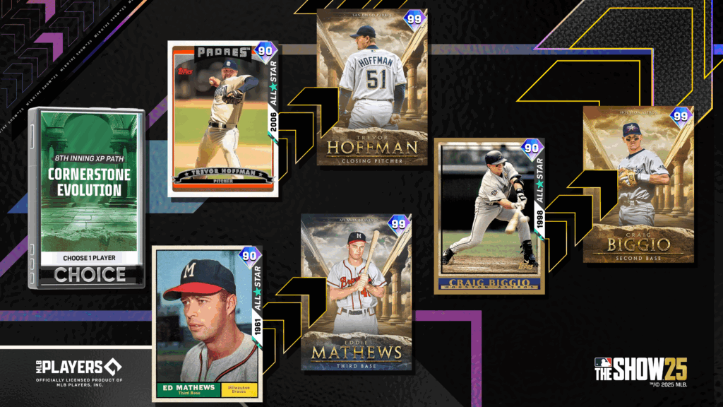 Earn 8th Inning Reward Path Cornerstone Evolution Packs in the 8th Inning XP Reward Path to add All-Star Series Craig Biggio (90 OVR), All-Star Series Eddie Mathews (90 OVR), and All-Star Series Trevor Hoffman (90 OVR) to your lineup. Use these player items to begin the all-new 8th Inning Cornerstone Evolution Programs, available in Assorted Programs, where you’ll complete Moments and Missions featuring each player to earn the Diamond Cornerstone Series Craig Biggio (99 OVR), Eddie Mathews (99 OVR), and Trevor Hoffman (99 OVR).