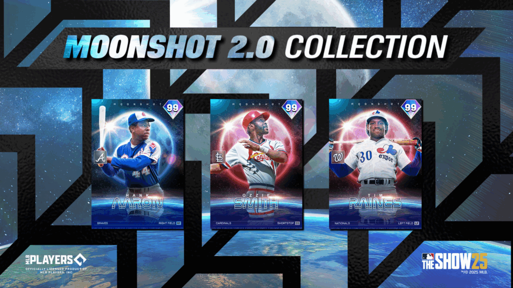 Swing for the fences in the all-new Moonshot 2.0 Program, only available in MLB The Show 25. Play Moments featuring Moonshot 2.0 Program players, including the Optional Extreme: Higher Gravity Moments, to start your progression in the program. Try your hand at the Moonshot 2.0 Program Missions, Moonshot Series Missions, and the Optional Moonshot 2.0 Event Missions to earn additional progress. Complete the updated Moonshot Series Collection, and the Optional: Moonshot 2.0 Pack Collections, to add the following “out of this world” rewards to your Diamond Dynasty squad: