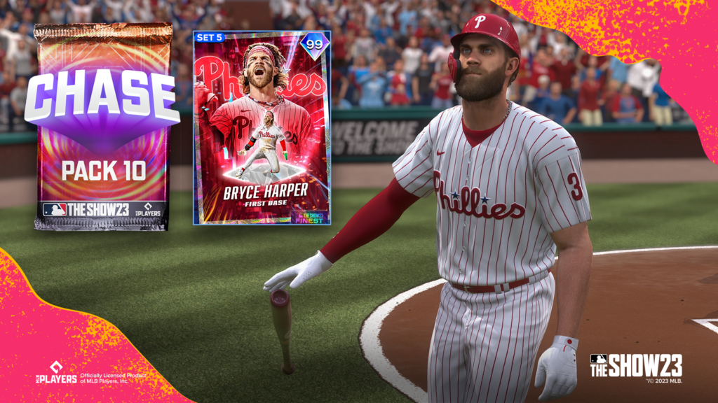 Every purchase of The Show 50-Pack Bundle includes one Chase Pack 10, and don’t forget there’s a chance to find the Chase Pack in every individual The Show Pack as well. The Chase Pack guarantees 1 Diamond or better player item with a chance to find the featured Chase Pack player item, 2023 Finest Series Bryce Harper.