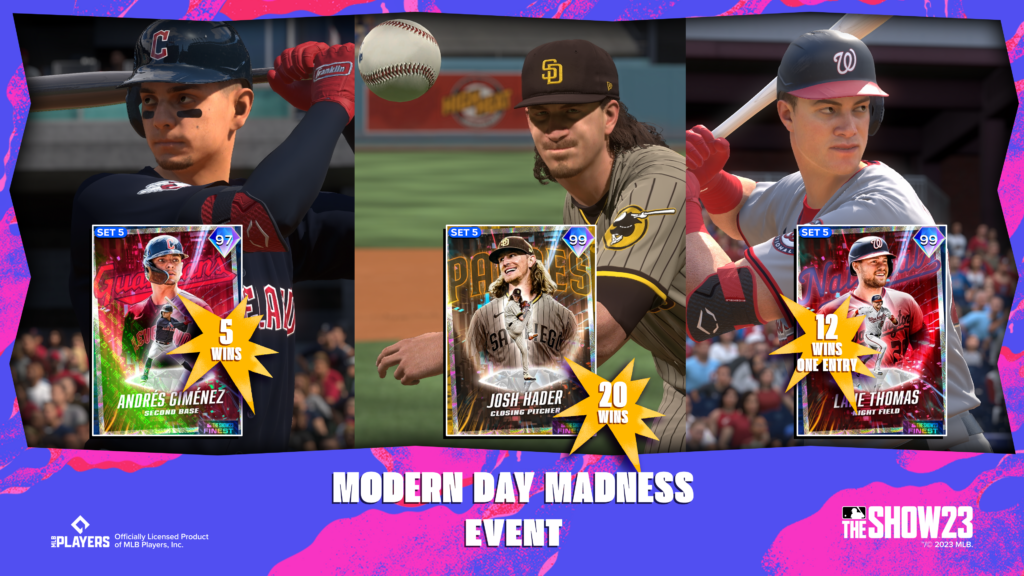 Get your mitts on more 2023 Finest Series players by taking on the Modern Day Madness Event available today in MLB The Show 23. Earn 2023 Finest Series Andres Gimenez (97 OVR) at 5 wins, 2023 Finest Series Josh Hader (99 OVR) at 20 wins, 2023 Finest Series Lane Thomas (99 OVR) for earning 12 wins in one entry (12-1 or 12-0) before double elimination.