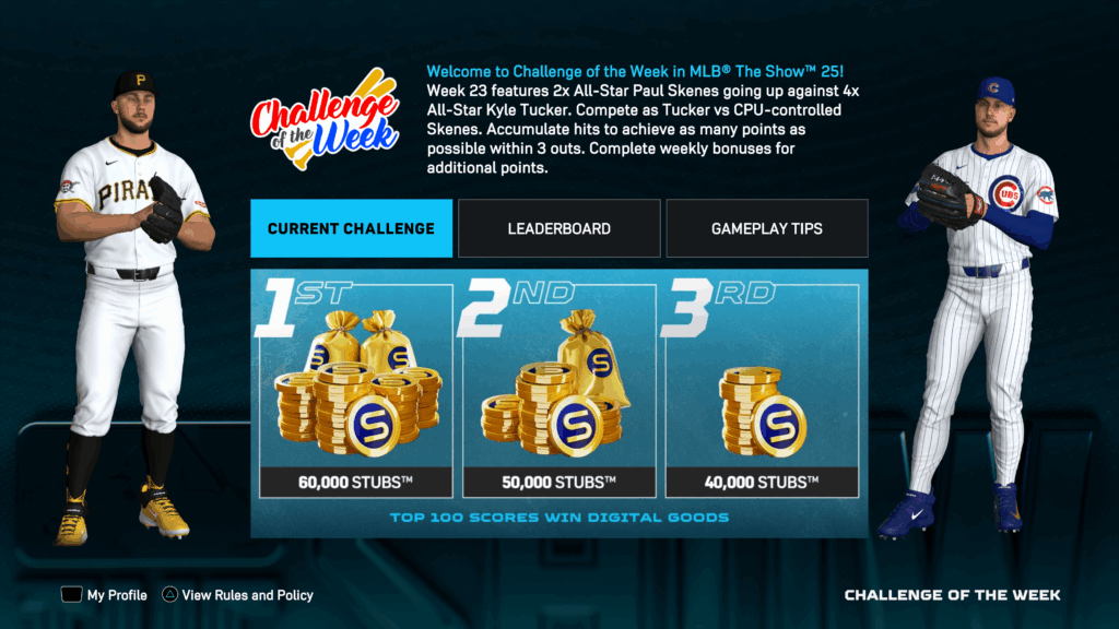 Challenge of the Week 23, available in Instant Action, features 2-time All-Star Paul Skenes going up against 4-time All-Star Kyle Tucker. Compete as Tucker vs CPU-controlled Skenes and accumulate hits to achieve as many points as possible within three outs for a chance to earn Stubs for use in MLB The Show 25.