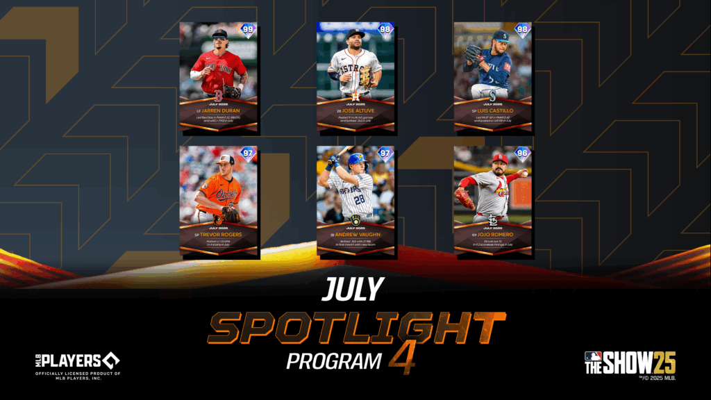 Complete July Spotlight Programs – Drops 1 through 4, then collect each of the July Spotlight Programs featured players (Addison Barger, Cody Bellinger, Shea Langeliers, and Jarren Duran) in the Spotlight Series July Lightning Collection, only available in MLB The Show 25, to add Lightning Willy Adames (99 OVR) to your Diamond Dynasty roster.